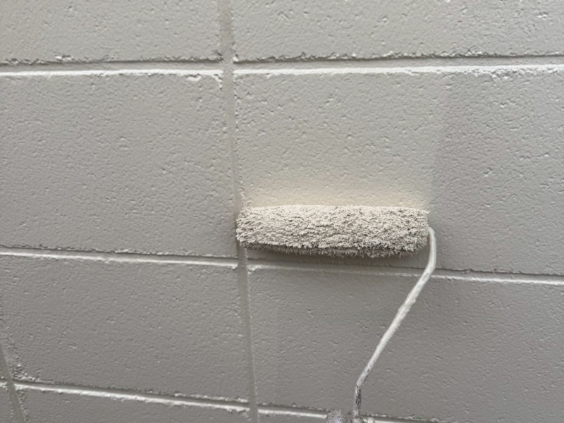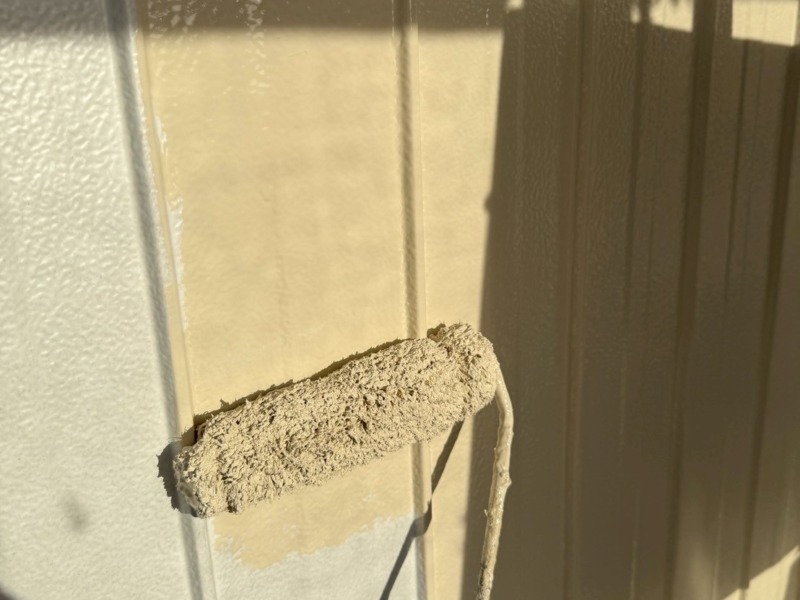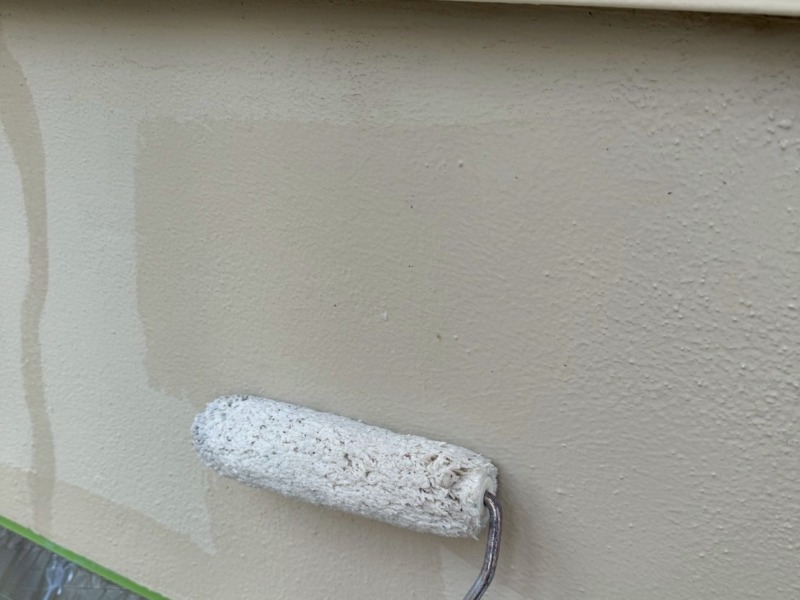 外壁の上塗り2回目です。ムラが出ないように、均一に均しながら塗っていきます。