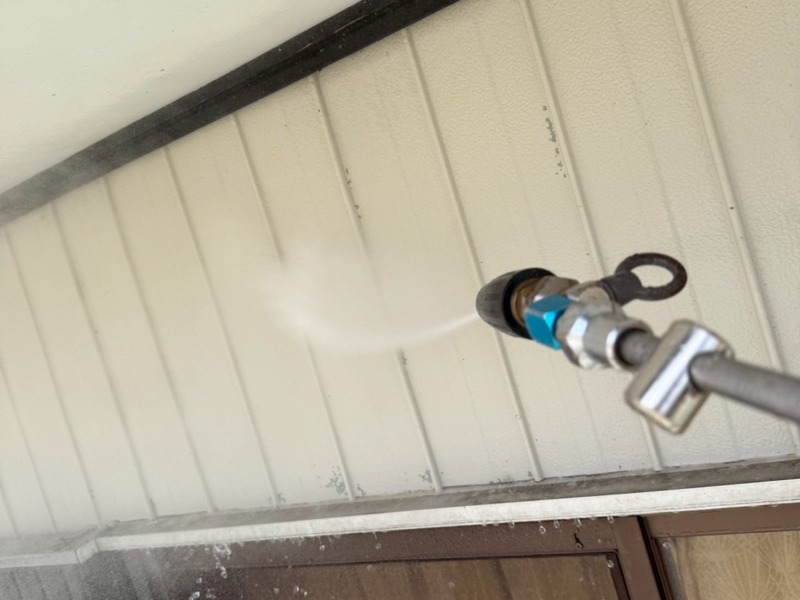 高圧洗浄でチョーキング・汚れ・コケなどをしっかりと洗っていきます。高圧洗浄を丁寧に行わないと仕上げが悪くなったり、耐久性が悪くなるため、注意が必要です。