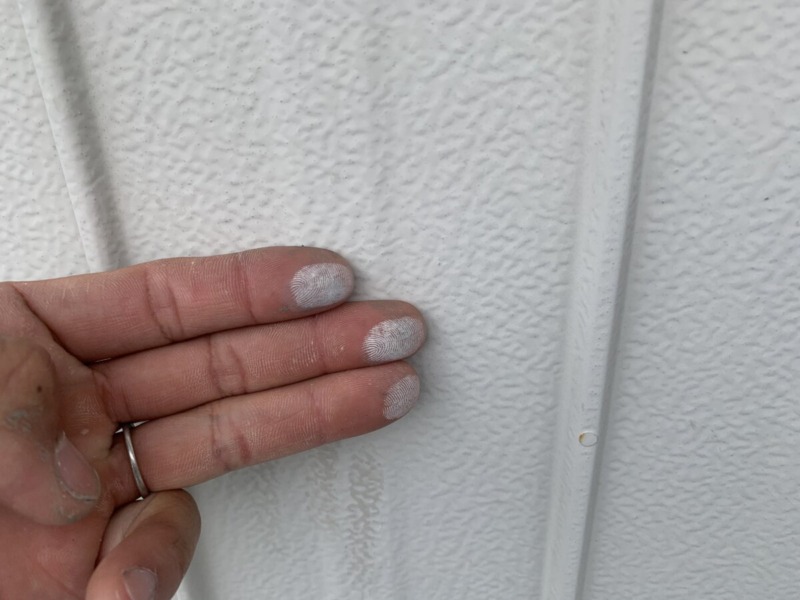 経年劣化による、チョーキングの発生が見られました。チョーキングは、紫外線などにより、塗料の樹脂分と顔料分が分離し顔料が浮き出てくる現象を言います。塗膜が劣化しているサインです。