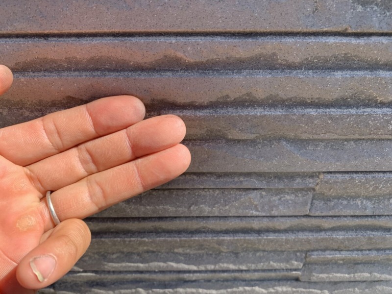 経年劣化による、チョーキングの発生が見られました。チョーキングは、紫外線などにより、塗料の樹脂分と顔料分が分離し顔料が浮き出てくる現象を言います。塗膜が劣化しているサインです。