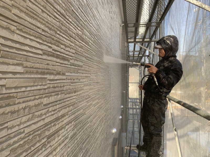 高圧洗浄でチョーキング・汚れ・コケなどをしっかりと洗っていきます。高圧洗浄を丁寧に行わないと仕上げが悪くなったり、耐久性が悪くなるため、注意が必要です。