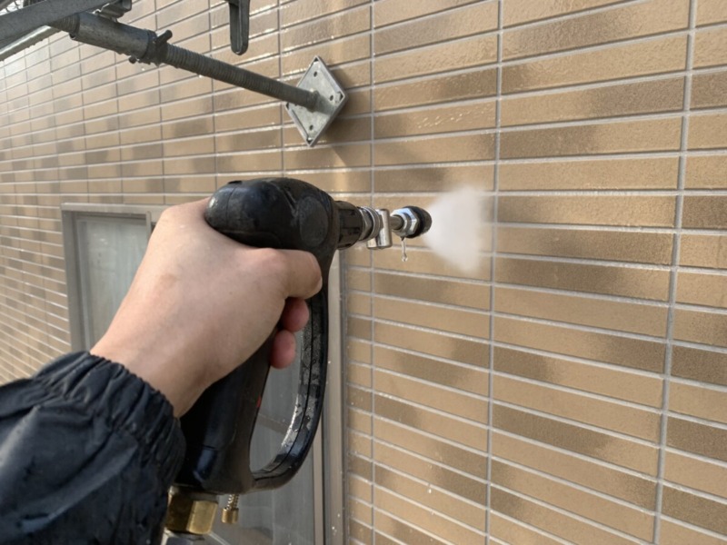 外壁の高圧洗浄です。細部まで綺麗に洗い流していきます。