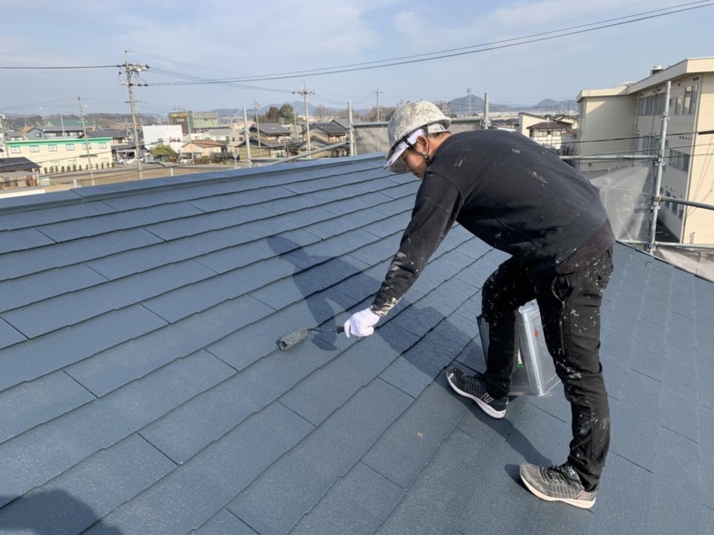 屋根上塗り2回目です。たっぷりと塗っていきます。