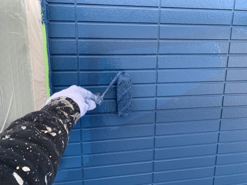 外壁上塗り2回目です。ムラが出ないように均一に均しながら塗っていきます。