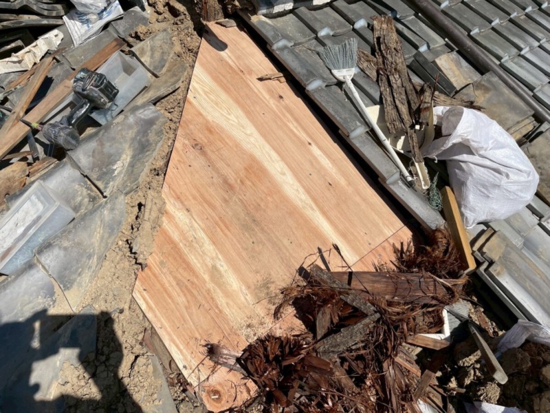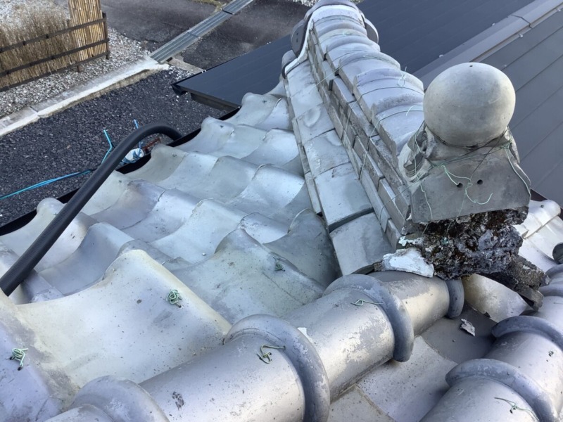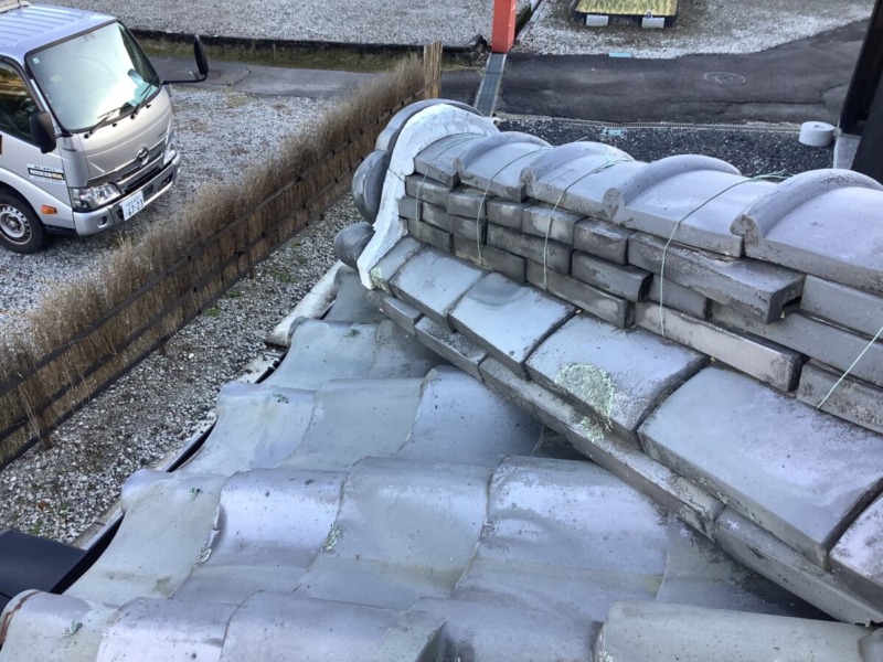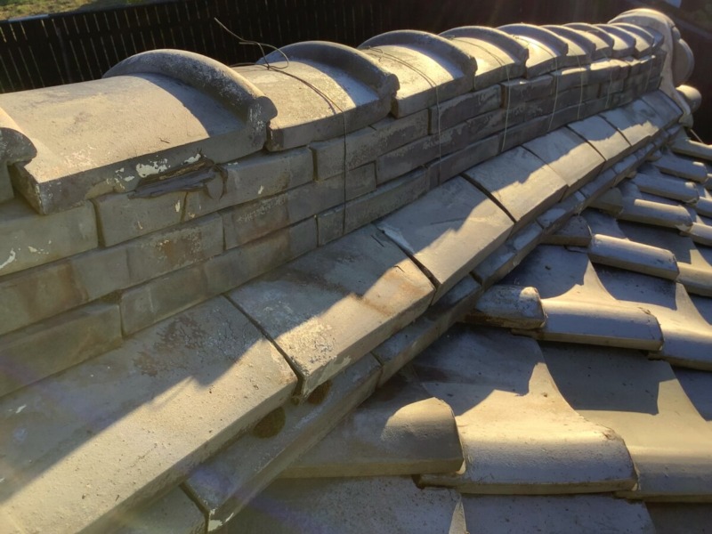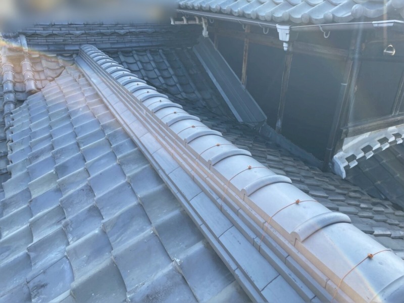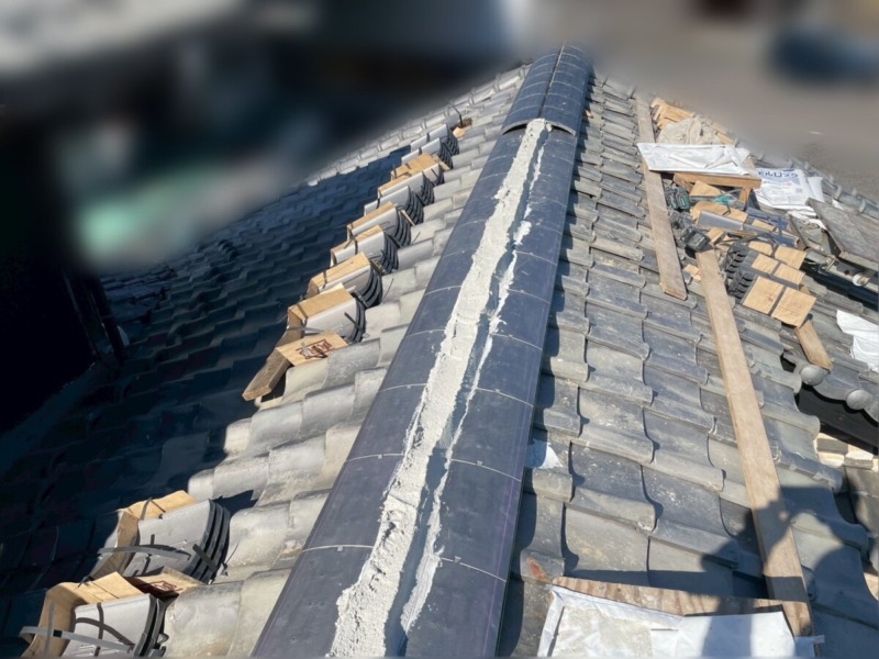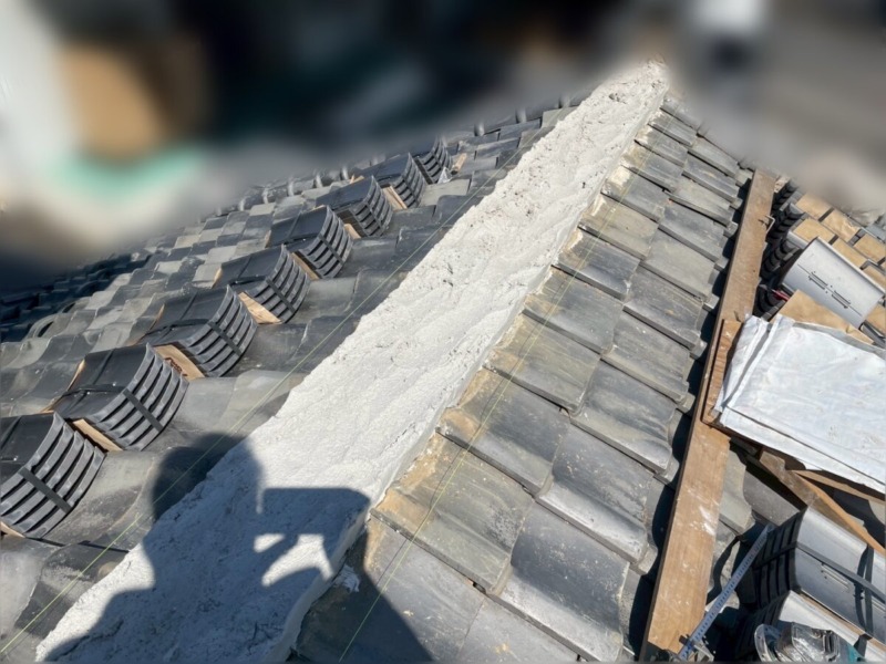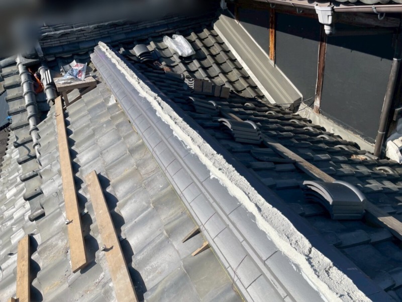棟部積み直し状況です。新品の瓦を使用していきます。